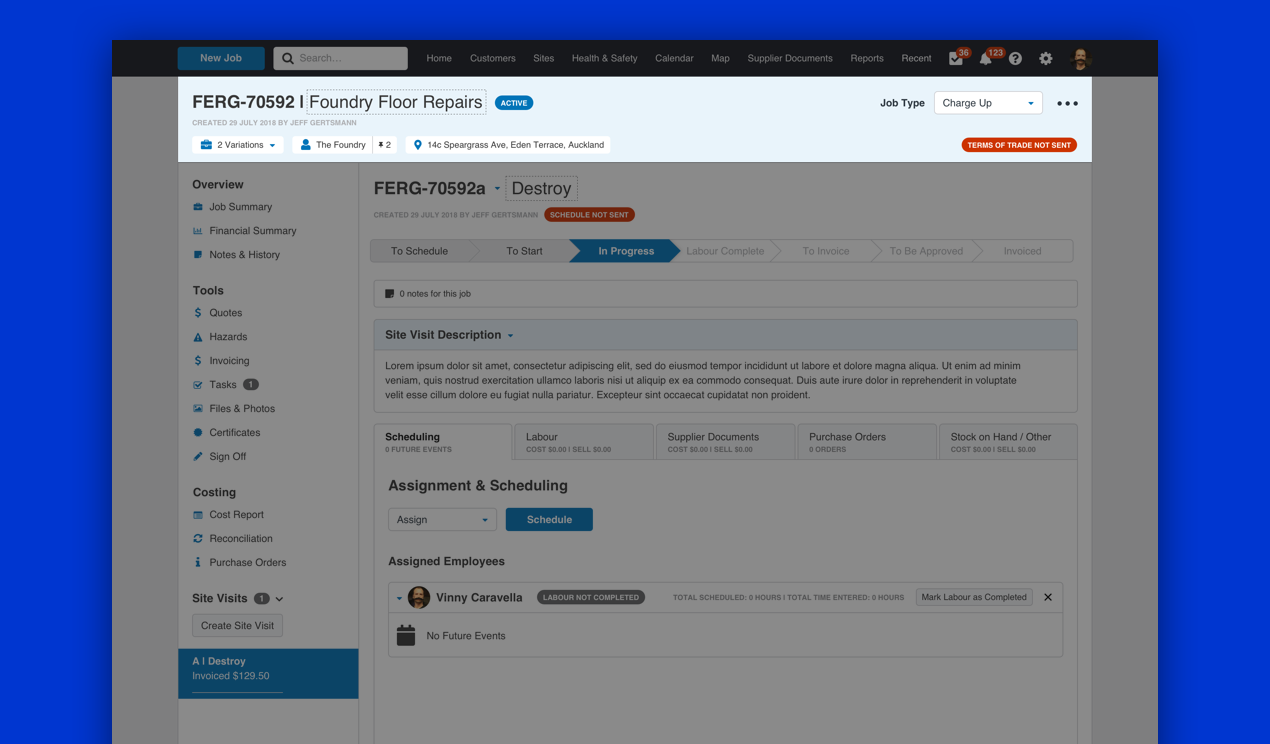 The first thing we did was reorganise vital job info into a header format. Previously, users would have to scroll up to the top of the page or even redirect entirely just to review customer and address info. With the new header format, users can now easily access customer, address and contact info without moving away from the page they are working on.